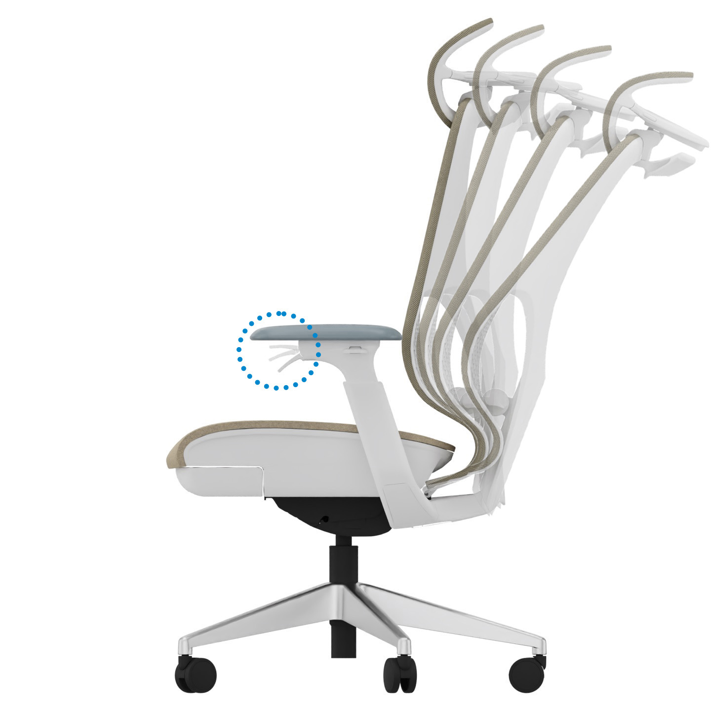 - Trwała podstawa z polerowanego aluminium: Pięcioramienna podstawa z polerowanego aluminium z kółkami fi60 zapewnia stabilność i łatwość przemieszczania się.