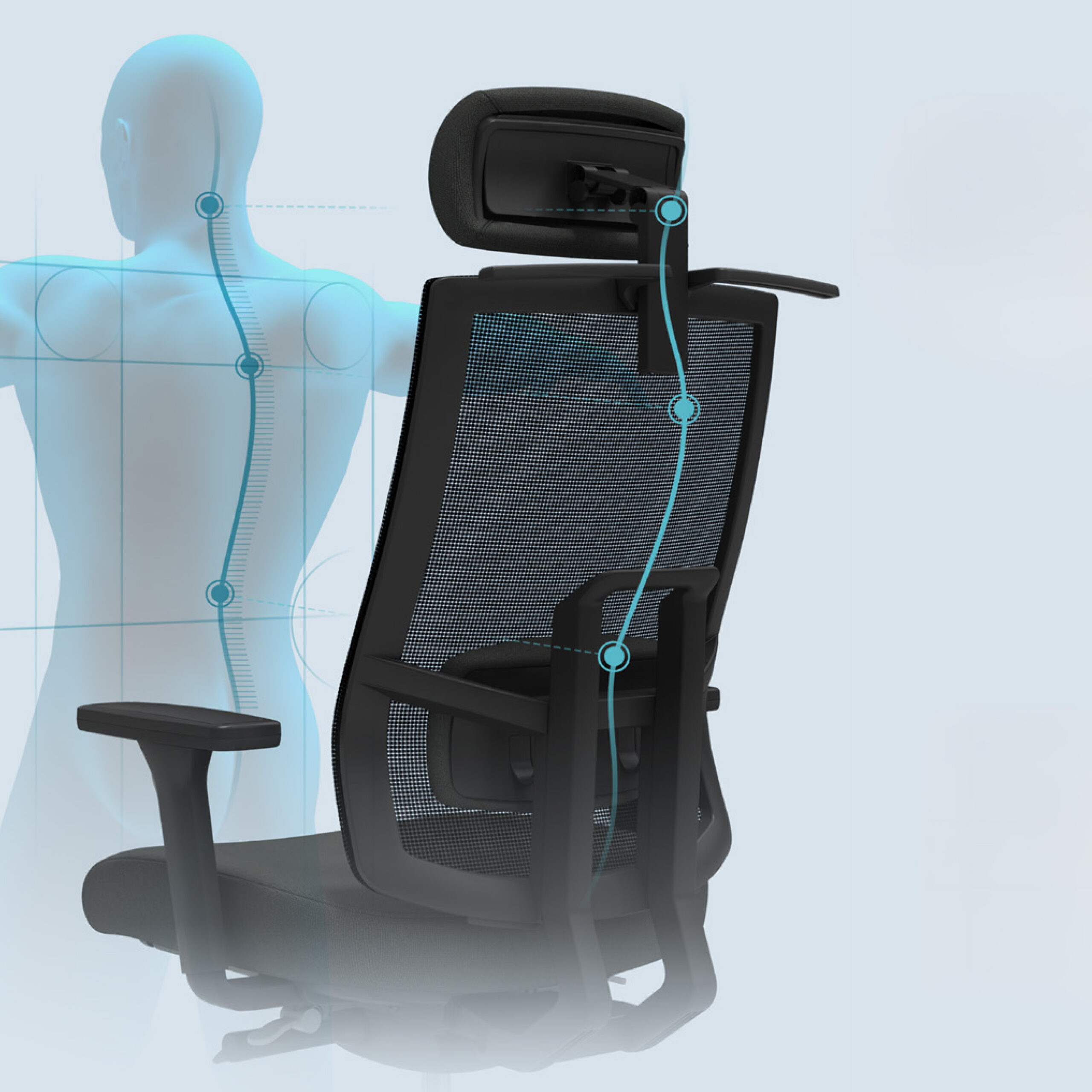 Ergonomiczny fotel biurowy z podłokietnikami 4D i zagłówkiem 3D