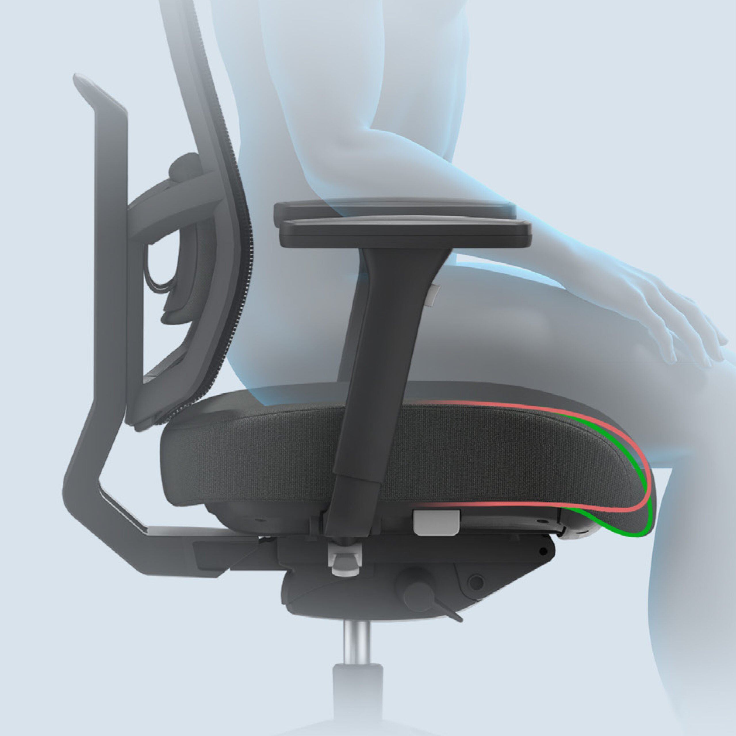 Posiada zaokrągloną krawędź przednią w celu zmniejszenia ucisku na mięśnie ud i zapobiegania uczuciu drętwienia kończyn dolnych podczas utrzymywania pochylonej do przodu pozycji ciała (np. podczas pisania).
